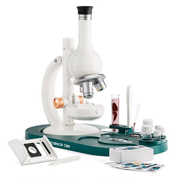 Los niños lo usan para descubrir las células, microorganismos y seres vivos más diminutos. El set incluye una práctica estación de laboratorio experimental con espacio para el microscopio y diversos equipos. El microscopio de diseño elegante, con un aumento HD de hasta 1600x y un atractivo modo de doble luz