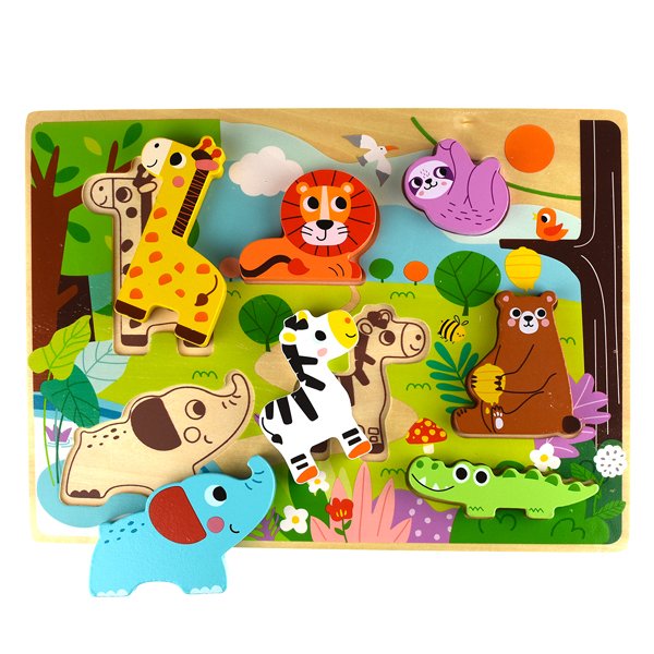 Sumérgete en una jungla de diversión con el rompecabezas de madera con forma de animal, donde las coloridas piezas de animales encajan perfectamente en sus lugares y luego saltan a aventuras independientes para un juego imaginativo sin fin.