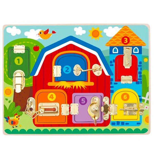 El tablero de cierres de madera es un juego entretenido y educativo que ayuda a los niños a desarrollar destreza mientras manejan cierres que se enganchan, encajan, hacen clic y se deslizan.