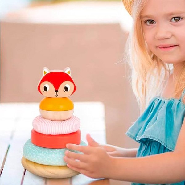 Con una combinación de madera maciza y anillos de tela, desarma la torre del zorro y descubre de cuántas maneras diferentes puedes apilarla. ¡Ninguna es incorrecta!