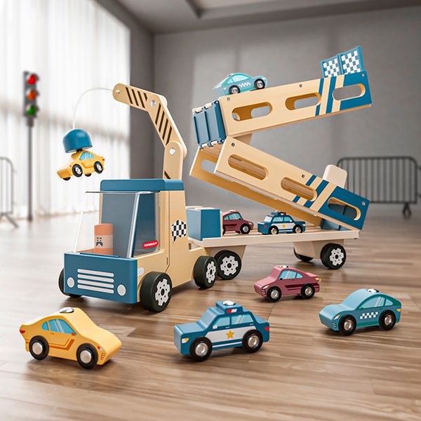 No es solo un divertido transportador de coches, sino también una emocionante pista de carreras. El transportador móvil tiene espacio para ocho coches pequeños en dos niveles. En tan solo unos sencillos pasos, el transportador de coches de madera se transforma en una pista de carreras de 103 centímetros de largo y dos carriles que invita a los niños a participar en carreras de coches.